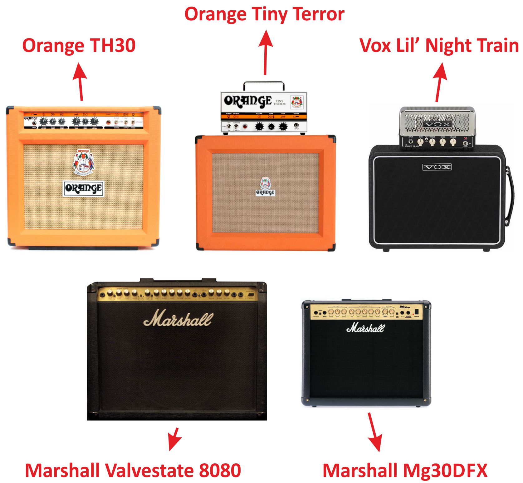 Orange TH30 30w (9 válvulas) – Combo com 1 falante Celestion de 12, 2 canais (limpo e drive) e loop de efeitos valvulado. Pode ser usado com 7, 15 e 30w, gerando um bom leque de timbres. Como todo amplificador Orange, a perfeição do projeto faz com que pouca energia se dissipe, então muito som é gerado. Ideal para ensaios e shows.